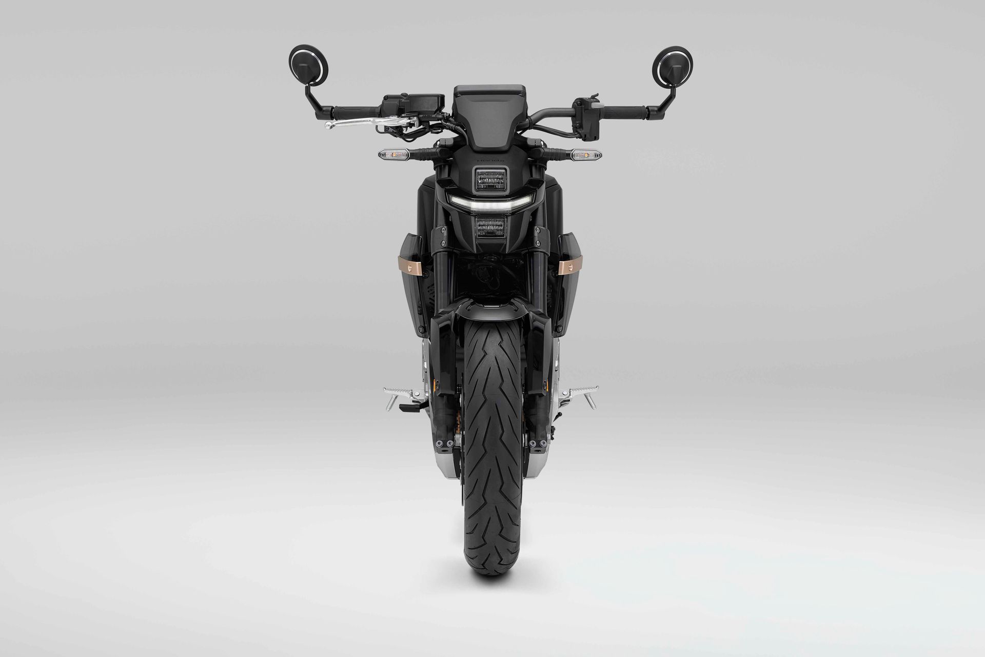 Compact twin projector headlights complement the slim front cover to illuminate the road ahead. Horizontal daytime running lights accentuate the motorcycle's front face.