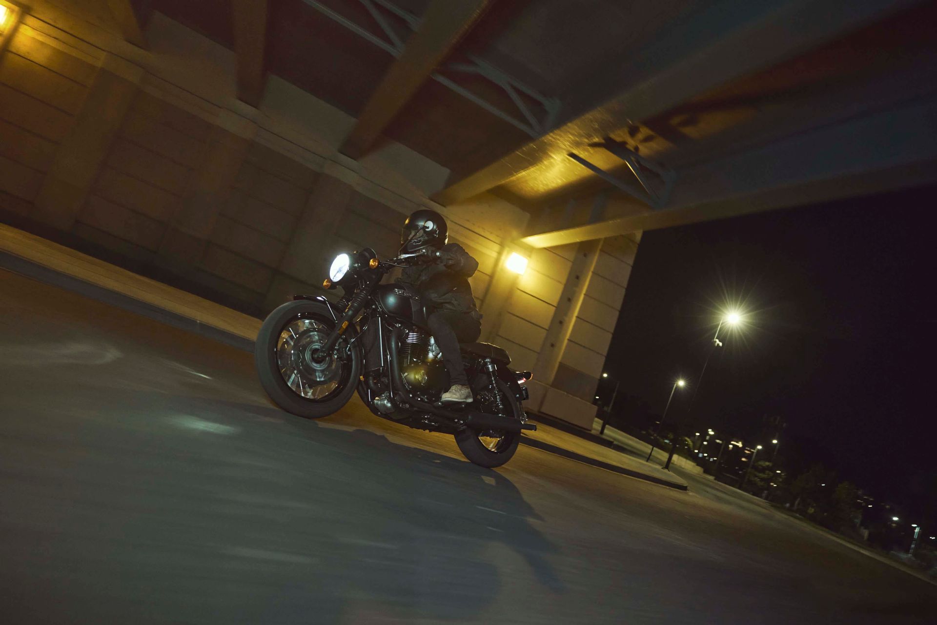 From the twin exhaust, engine casings wheels and badging the T120 Blacks understated finishes are complemented by a brown bench seat understated style with attitude.